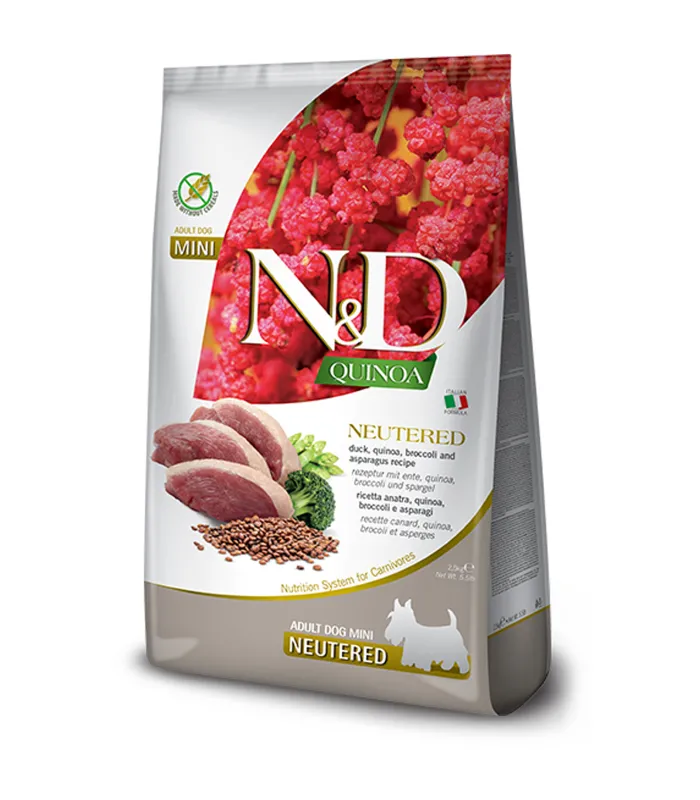Farmina N&D Quinoa Duck, Broccoli & Asparagus Neutered – функціональний беззерновий корм, розроблений спеціально для стерилізованих собак дрібних порід. Формула допомагає підтримувати здорову вагу, роботу сечовидільної системи та покращує травлення.