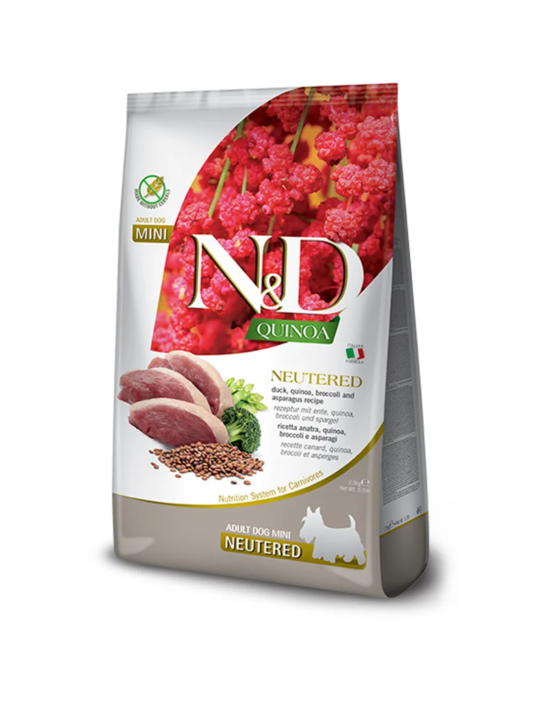 Farmina N&D Quinoa Duck, Broccoli & Asparagus Neutered – оптимальний вибір для здоров’я та довголіття стерилізованих собак дрібних порід.