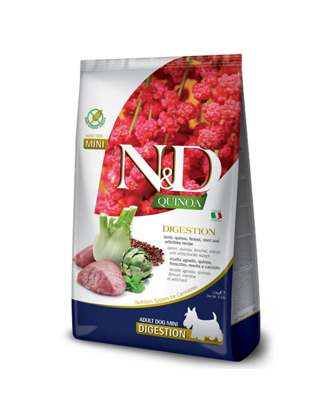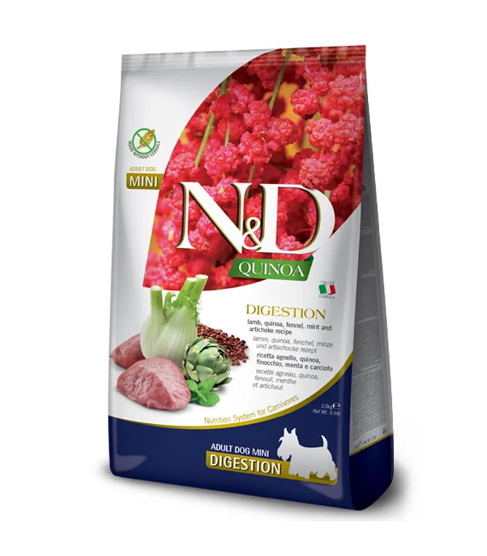 Farmina N&D Quinoa Dog Digestion Lamb & Fennel Adult Mini – повнораціонний беззерновий сухий корм для собак дрібних порід. Містить 22% ягнятини, 12% дегідратованого м’яса ягняти, 8% кіноа, фенхель, м’яту та артишок для підтримки травлення. Завдяки високоякісним білкам і пребіотикам корм покращує засвоєння поживних речовин і підходить для собак із чутливим шлунком чи екзокринною недостатністю підшлункової залози. Оптимальний вибір для здоров’я шерсті, шкіри та суглобів дорослих дрібних собак.