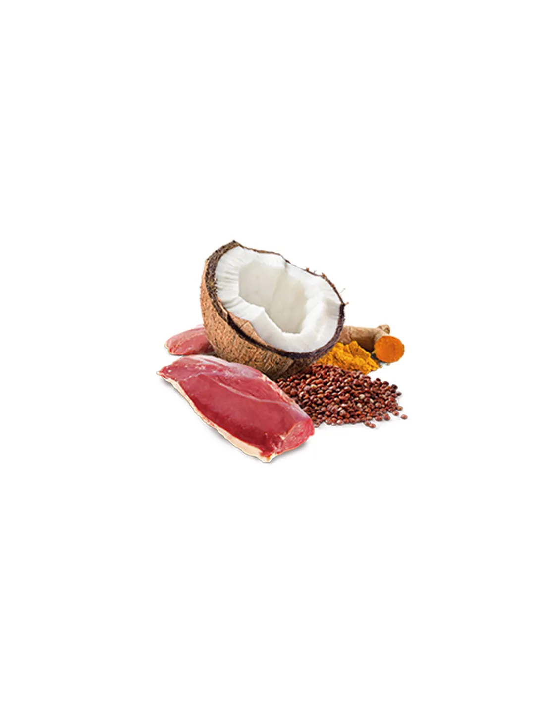 Інгредієнти: філе качки (55%), кіноа (5%), риб'ячий жир, кокос (2%), фруктоолігосахариди, холіну хлорид, хондроїтин сульфат, глюкозамін, вітаміни, мінерали. Джерело білка: філе качки. Джерело вуглеводів: кіноа.