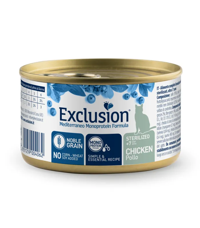 | Exclusion Sterilized/Adult Chicken | Сухий та вологий корм з курятиною для стерилізованих і дорослих котів, включаючи формулу для котів старше 7 років для підтримки рухливості. |