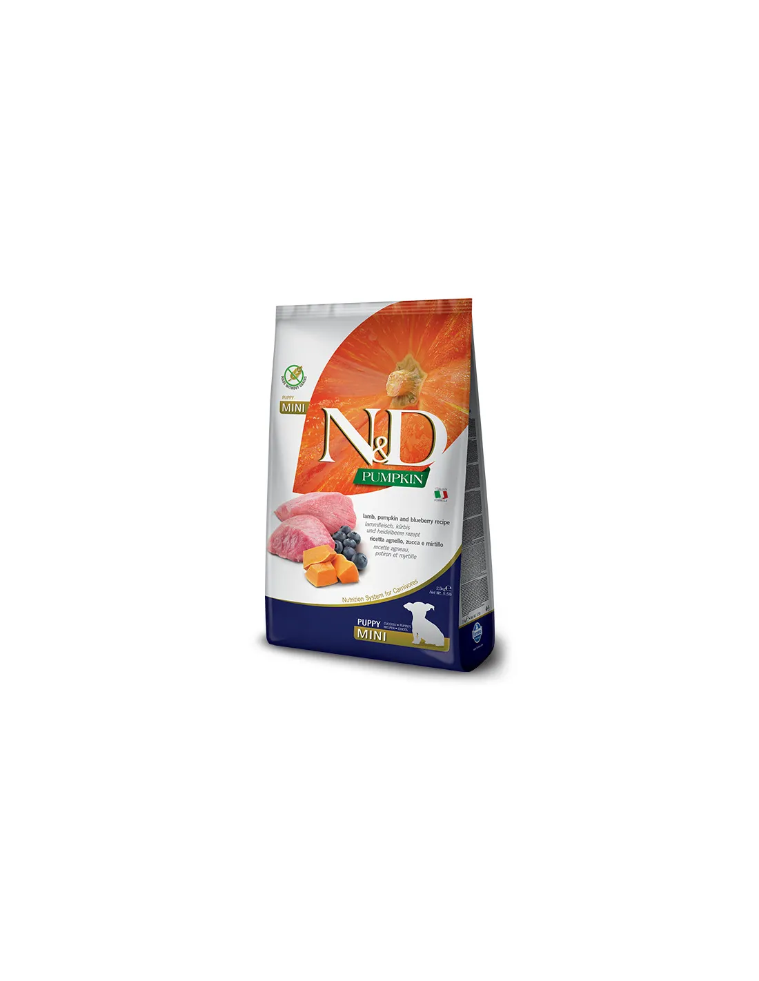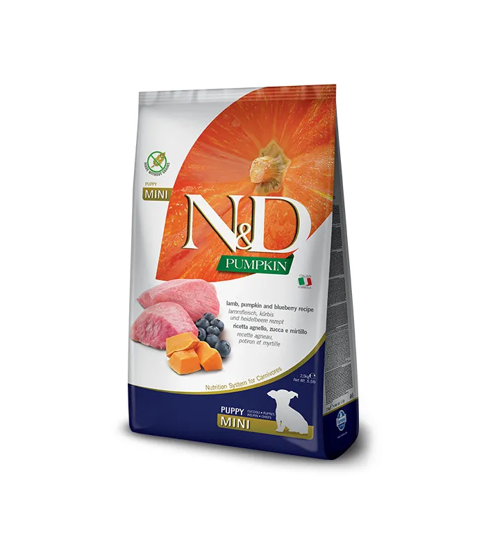 Farmina N & D Grain Free Pumpkin Puppy Mini Lamb and Blueberry - це повноцінний сухий корм для цуценят, вагітних і годуючих сук. Його ексклюзивна формула, що складається тільки з м'яса і без додавання злаків, замінена свіжими овочами та фруктами, дозволяє забезпечувати тварину необхідними поживними речовинами, сприяючи і покращуючи його самопочуття і здоров'я.
