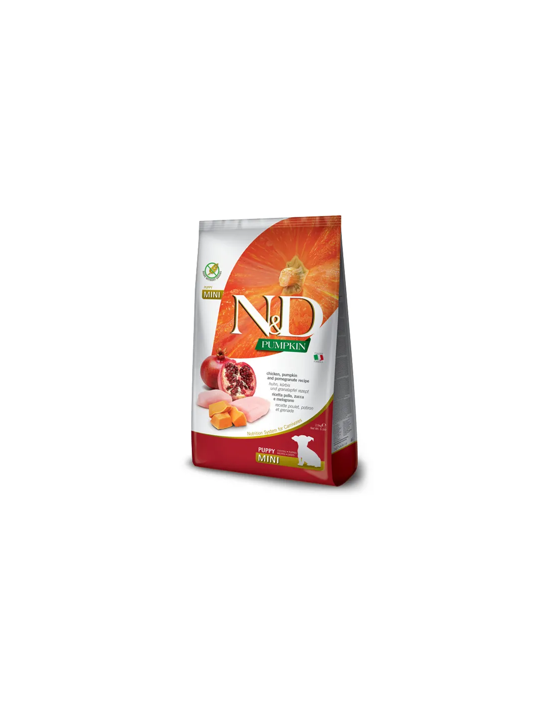 Ексклюзивна формула, Farmina Dog Grain Free Pumpkin Cnicken & Pomegranate Puppy Mini для цуценят дрібних порід, що складається тільки з м'яса і без додавання злаків, замінена свіжими овочами та фруктами, забезпечує тварину необхідними поживними речовинами, покращуючи його самопочуття і здоров'я.