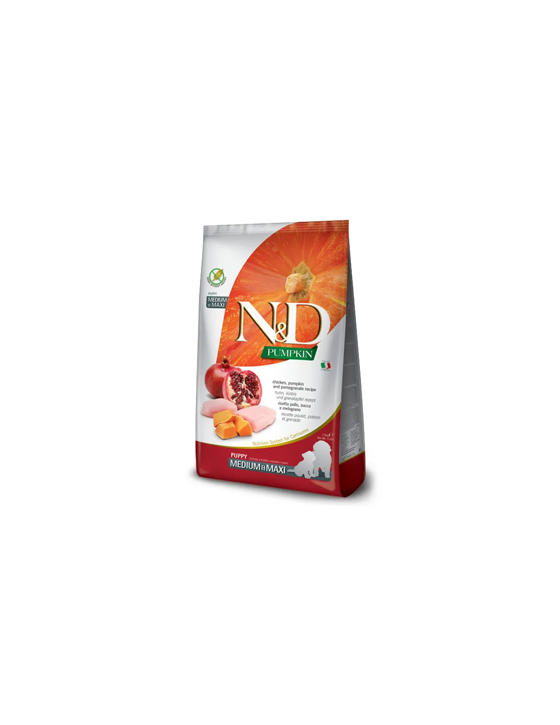 Ексклюзивна формула, Farmina Dog Grain Free Pumpkin Cnicken & Pomegranate Puppy MEDIUM & MAXI для цуценят средніх та великих порід, що складається тільки з м'яса і без додавання злаків, замінена свіжими овочами та фруктами, забезпечує тварину необхідними поживними речовинами, покращуючи його самопочуття і здоров'я.