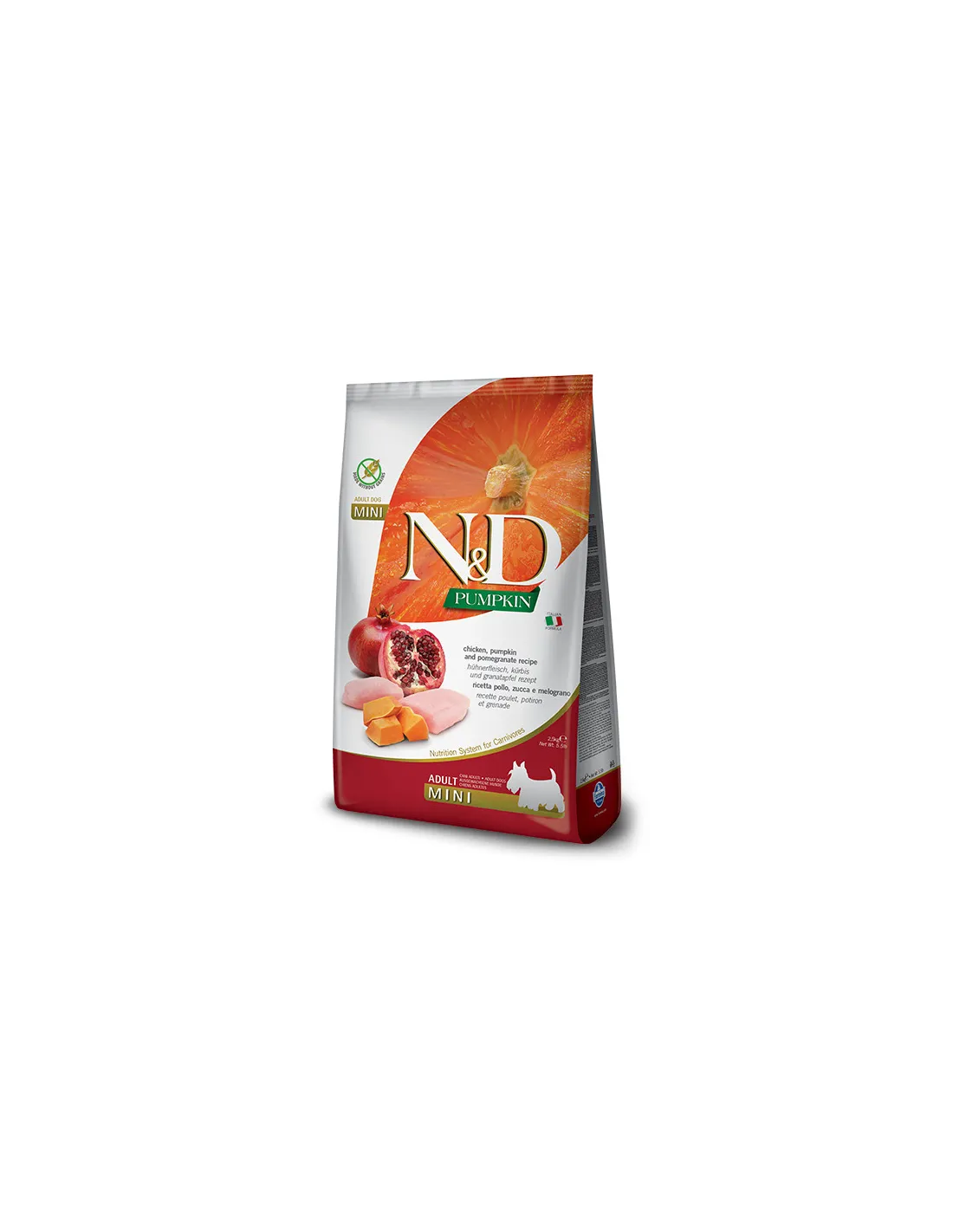 Ексклюзивна формула, Farmina Dog Grain Free Pumpkin Cnicken & Pomegranate Adult Mini для собак дрібних порід, що складається тільки з м'яса і без додавання злаків, замінена свіжими овочами та фруктами, забезпечує тварину необхідними поживними речовинами, покращуючи його самопочуття і здоров'я.