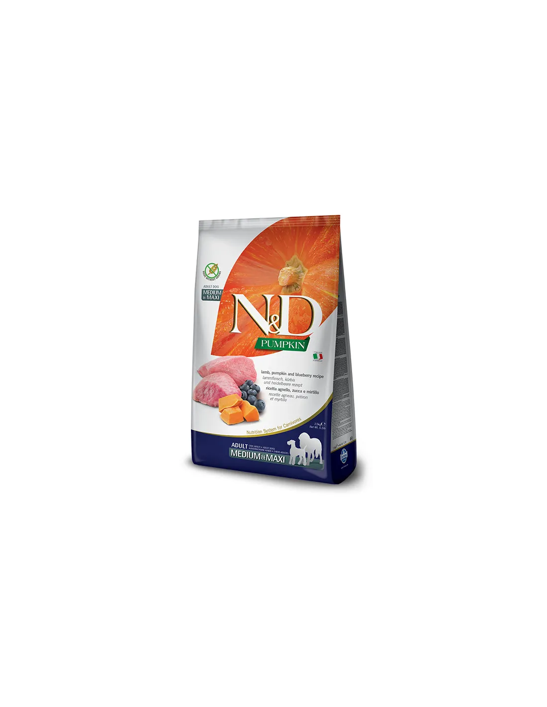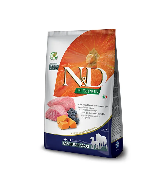 Ексклюзивна формула Farmina N & D Grain Free Pumpkin Adult MEDIUM & MAXI Lamb and Blueberry, що складається тільки з м'яса і без додавання злаків, замінена овочами і свіжими фруктами, забезпечує тварину необхідними поживними речовинами, сприяючи його самопочуттю і здоров'ю.