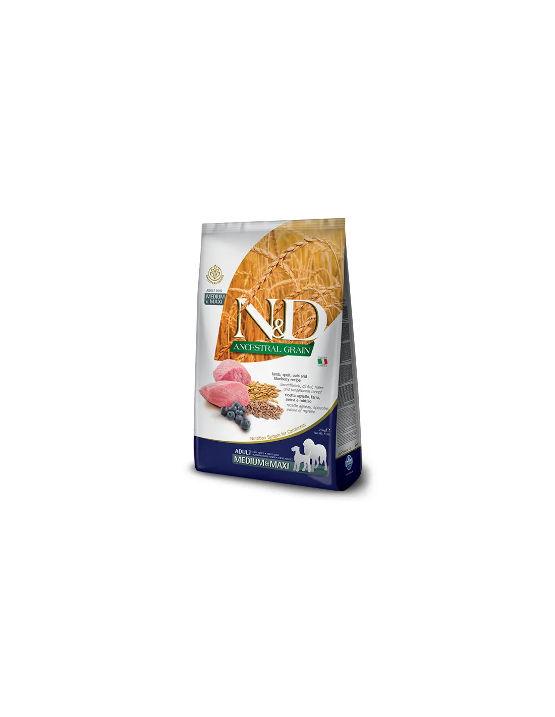 Farmina N & D Ancestral Grain ADULT MEDIUM & MAXI Lamb and Blueberry для дорослих собак середніх і великих порід, багатий тваринним білком, фруктами, овочами, мінералами і невеликою кількістю спадкових злаків. З крокетами Farmina N & D Ancestral Grain ADULT MEDIUM & MAXI Lamb and Blueberry ви запропонуєте своїй собаці корисний і смачний сухий корм. Його склад був створений у співпраці з факультетом харчування тварин Неаполітанського університету і заснований на моделі природи, а також орієнтований на особливі потреби в харчуванні дорослих собак.