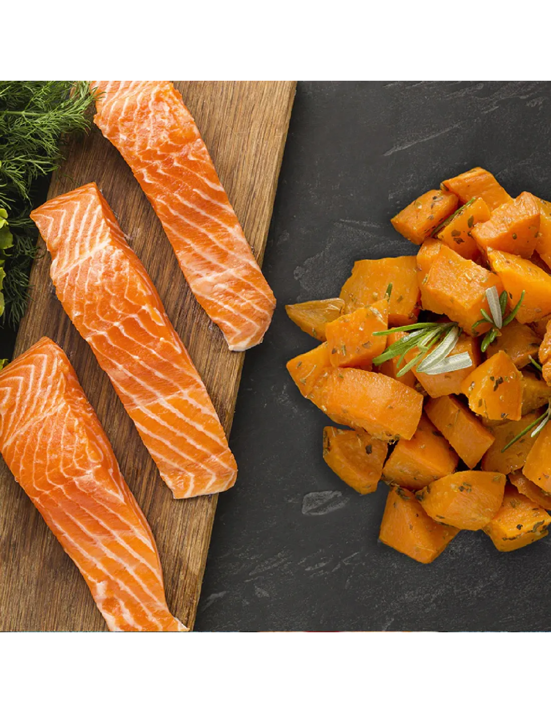 Склад: 90% свіжа риба та м’ясо (58% свіжа індичка, 27% свіжий лосось, 5% свіжа куряча печінка), 4% батат, тапіока, клітковина буряка.