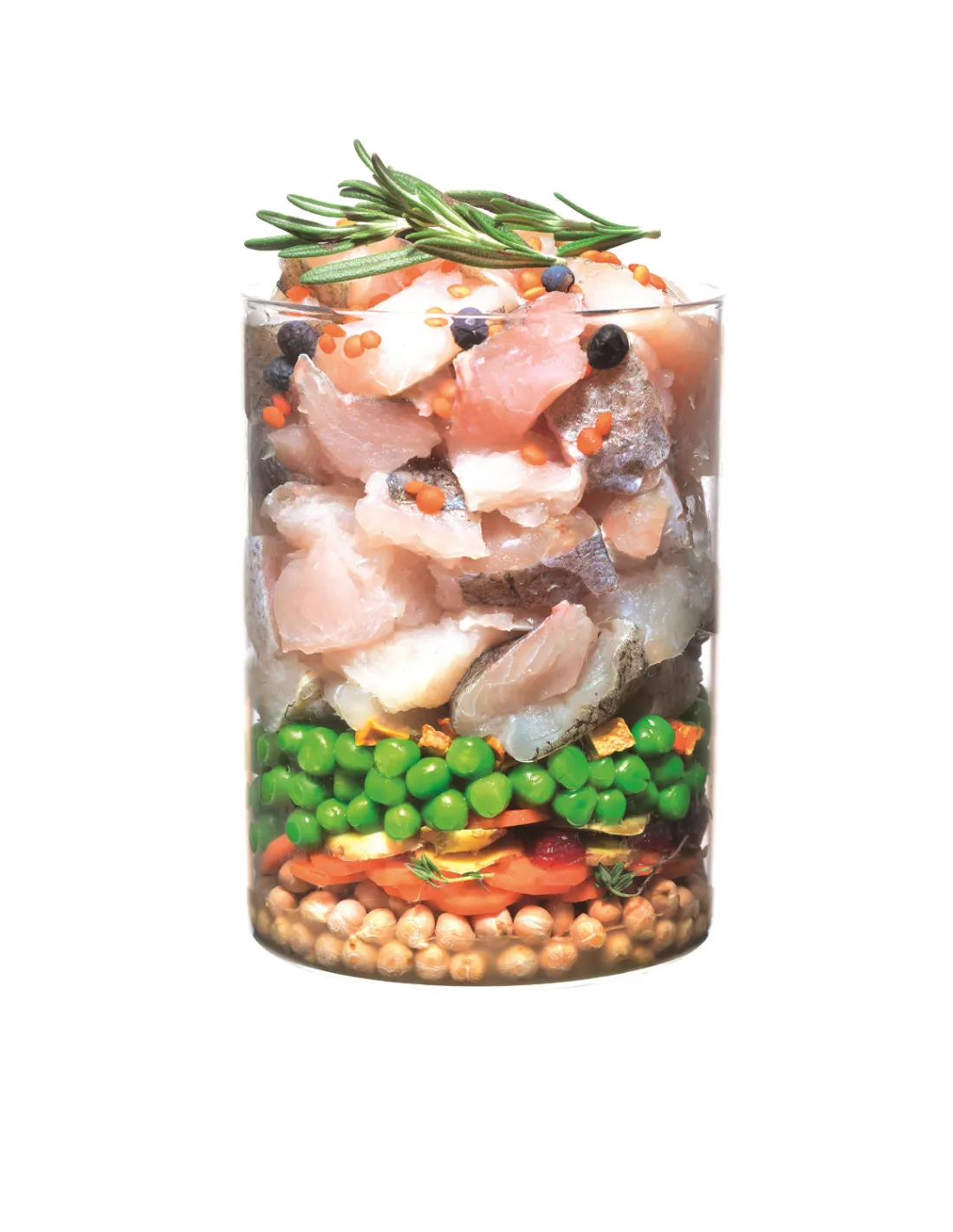 СКЛАД: свіжа риба (60%), горох, курячий жир (консервований токоферолами), нут (4%), сушені яблука (4%), червона сочевиця, гарбуз, лососева олія (3%), натуральні ароматизатори, морква, сушена яєчна шкаралупа, протеїн ряски (0,5 %), спіруліна (0,3 %), сушена обліпиха крушиноподібна (0,2 %), сушений корінь імбиру (0,1 %), сушена чорниця (0,1 %), сушений розмарин (0 ,1 %), сушена брусниця (0,1 %), сушений чебрець (0,1 %), глюкозамін (0,026 %), зеленогубий молюск (0,025 %), хондроїтину сульфат (0,016 %), пивні дріжджі (джерело мананолігосахаридів), корінь цикорію звичайного (джерело фруктоолігосахаридів, 0,01 %), Юка Шидігера (0,01 %).