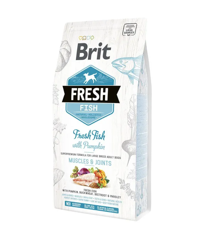 Для дорослих собак великих порід доступний Brit Fresh Adult Large Fish & Pumpkin, який включає свіжу рибу, гарбуз, гречку та трави. Цей корм підтримує м’язову масу, здоров’я шкіри та шерсті, а також загальну енергію собаки.