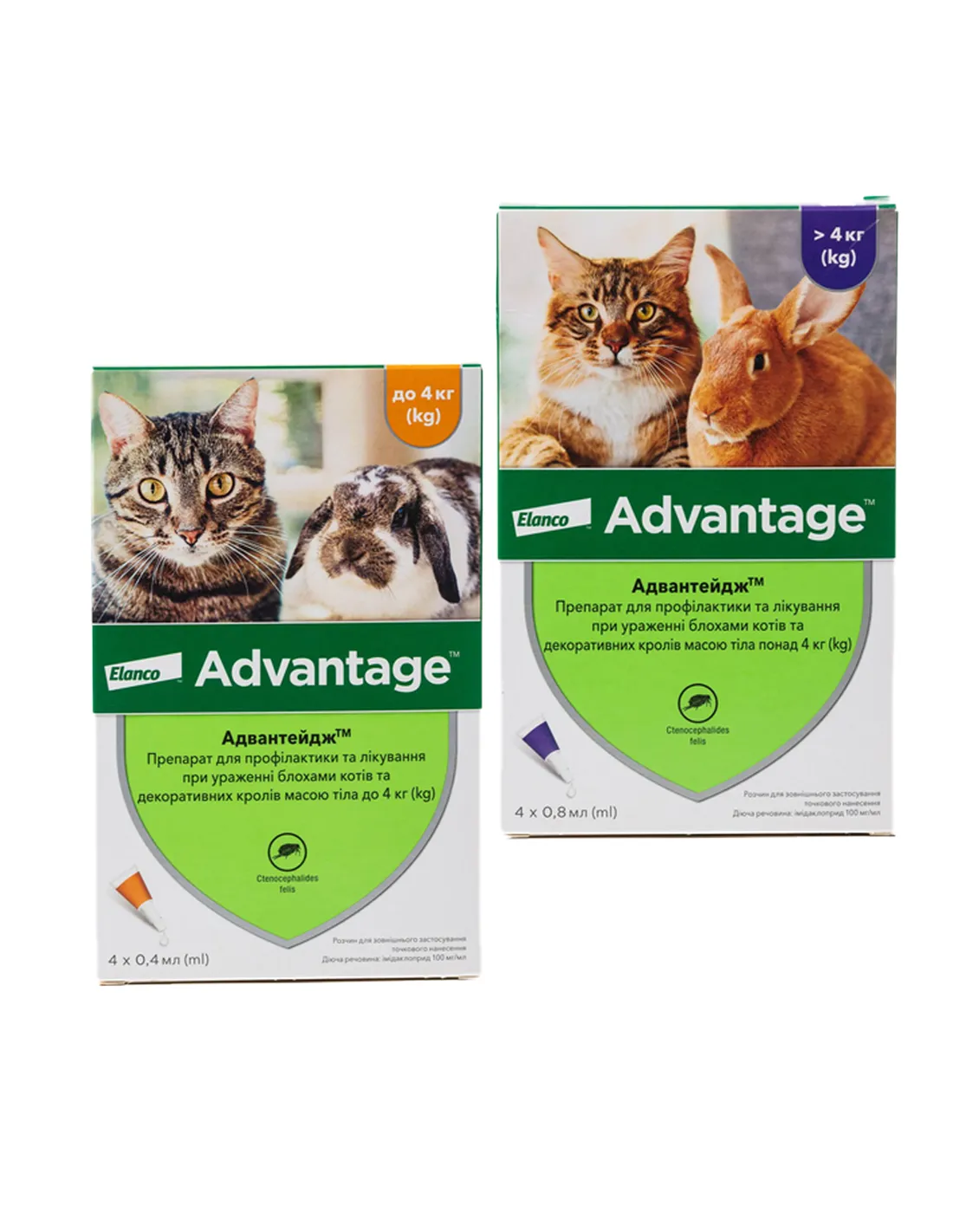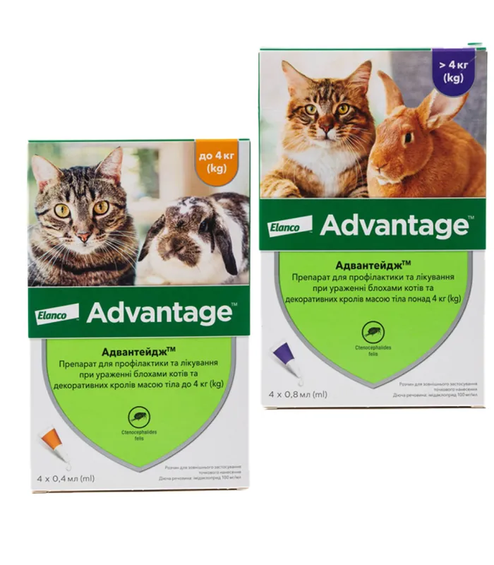 Адвантейдж® — ефективний засіб від бліх для котів та декоративних кроликів. Знищує бліх і їх личинки, діє за 3-5 хвилин, захищає до 28 днів. Підходить кошенятам з 8 тижнів, вагітним кішкам і кроленятам з 10 тижнів. Доступний у дозуваннях до та понад 4 кг. Упаковки вистачає на 4 місяці захисту.
