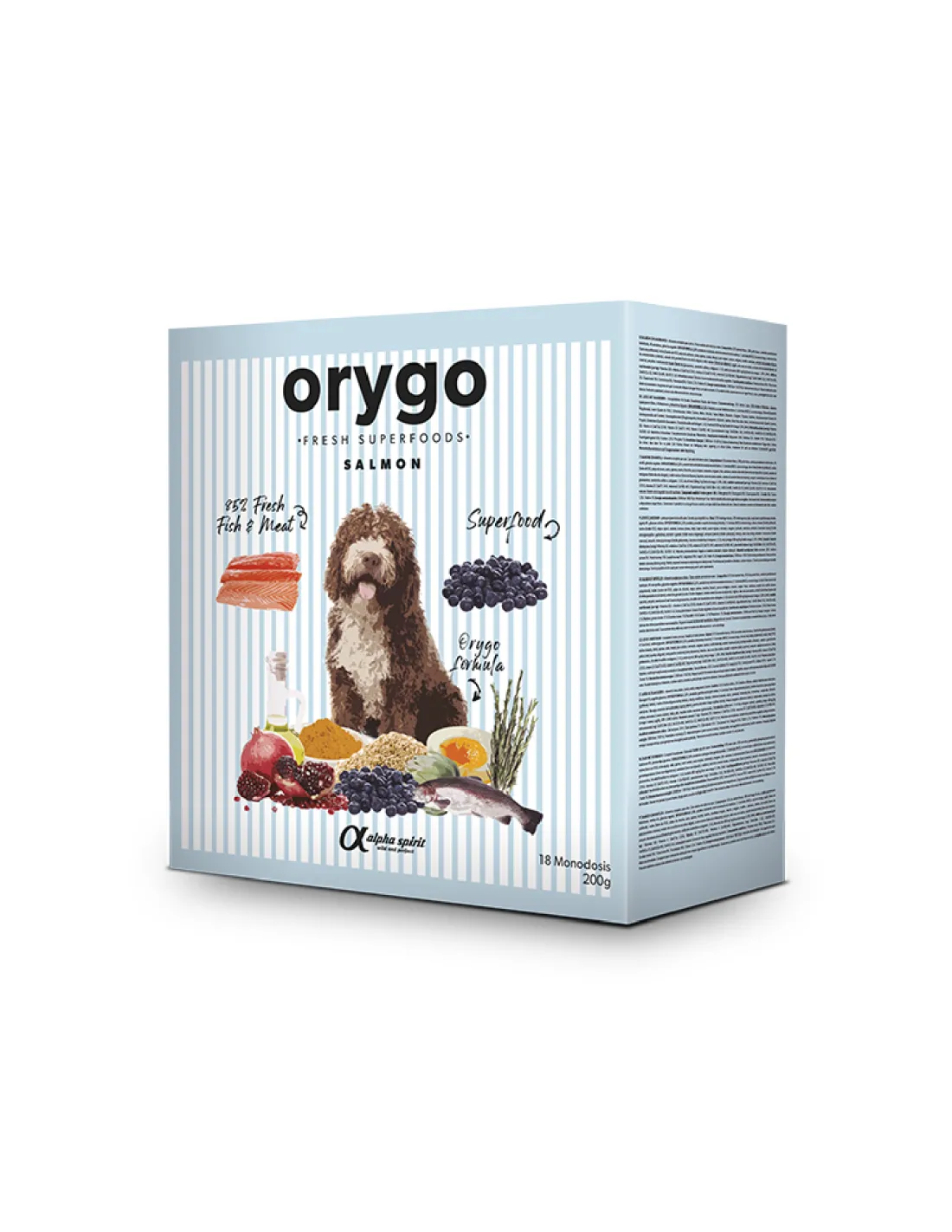 Склад: 55% свіжий лосось, 30% свіжа курка, частково гідролізований крохмаль, чорниця 4%, рослинний гліцерин. ORYGOFORMULA 2,6%: продукти ферментації дріжджів, S. Cerivisiae (MOS), куркума, оливкова олія (джерело поліфенолів), інулін (джерело ФОС), м'якоть цикорію, шавлія, кіноа, м'ята, фенхель, юка мохаве, розмарин, орегано, чебрець, валеріана, екстракт чорниці (джерело антоціанозидів і танінів), екстракт граната (джерело елагової кислоти), розторопша (джерело силімарину), солодка, алое вера без алоїну, екстракт артишоку (джерело цинарину), прополіс, яєчна мембрана (джерело глюкозаміну, хондроїтину сульфату та колагену I, V, X), олія форелі 500 мг/ кг (джерело омега-3, ЕПК, ДГК).