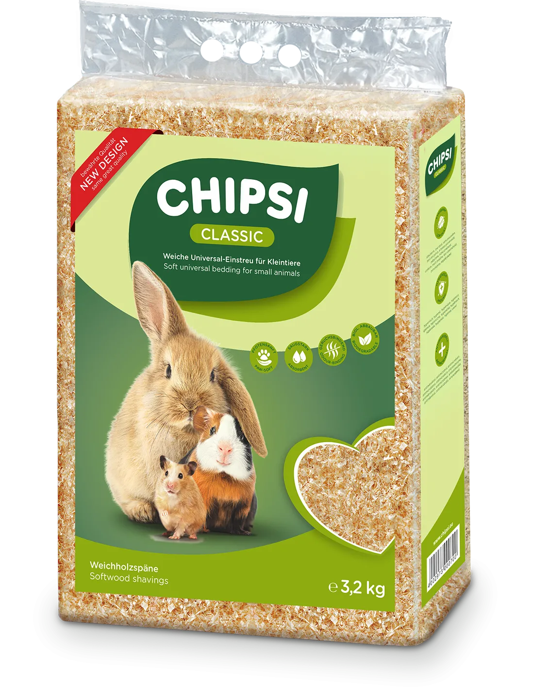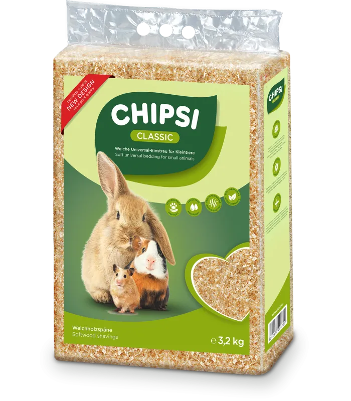 CHIPSI Classic — це класичний деревний наповнювач, виготовлений з м'якої деревини, такої як ялина та ялиця. Він відзначається високою поглинальною здатністю та ефективним контролем запахів. Цей наповнювач ідеально підходить для гризунів, таких як хом'яки, морські свинки та кролики.