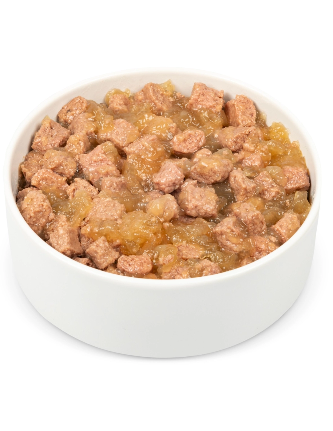 Склад: м'ясо та продукти тваринного походження не менше 85% у шматочках (зокрема з курки – 54%, з яловичини – 24%, з індички – 7%), злаки, сіль харчова – 0,3%. Шматочки становлять не менше 50%.
