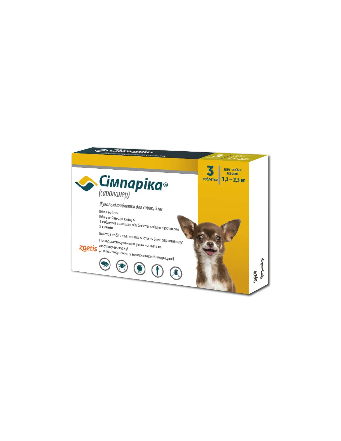 Simparica від ZOETIS – це щомісячна жувальна таблетка, яка починає діяти швидко, знищуючи бліх протягом 3 годин і кліщів протягом 8 годин. Вона забезпечує захист до 35 днів і ефективна проти різних видів кліщів, включаючи тих, що переносять лаймову хворобу. Simparica ідеально підходить для собак, які часто гуляють на природі.