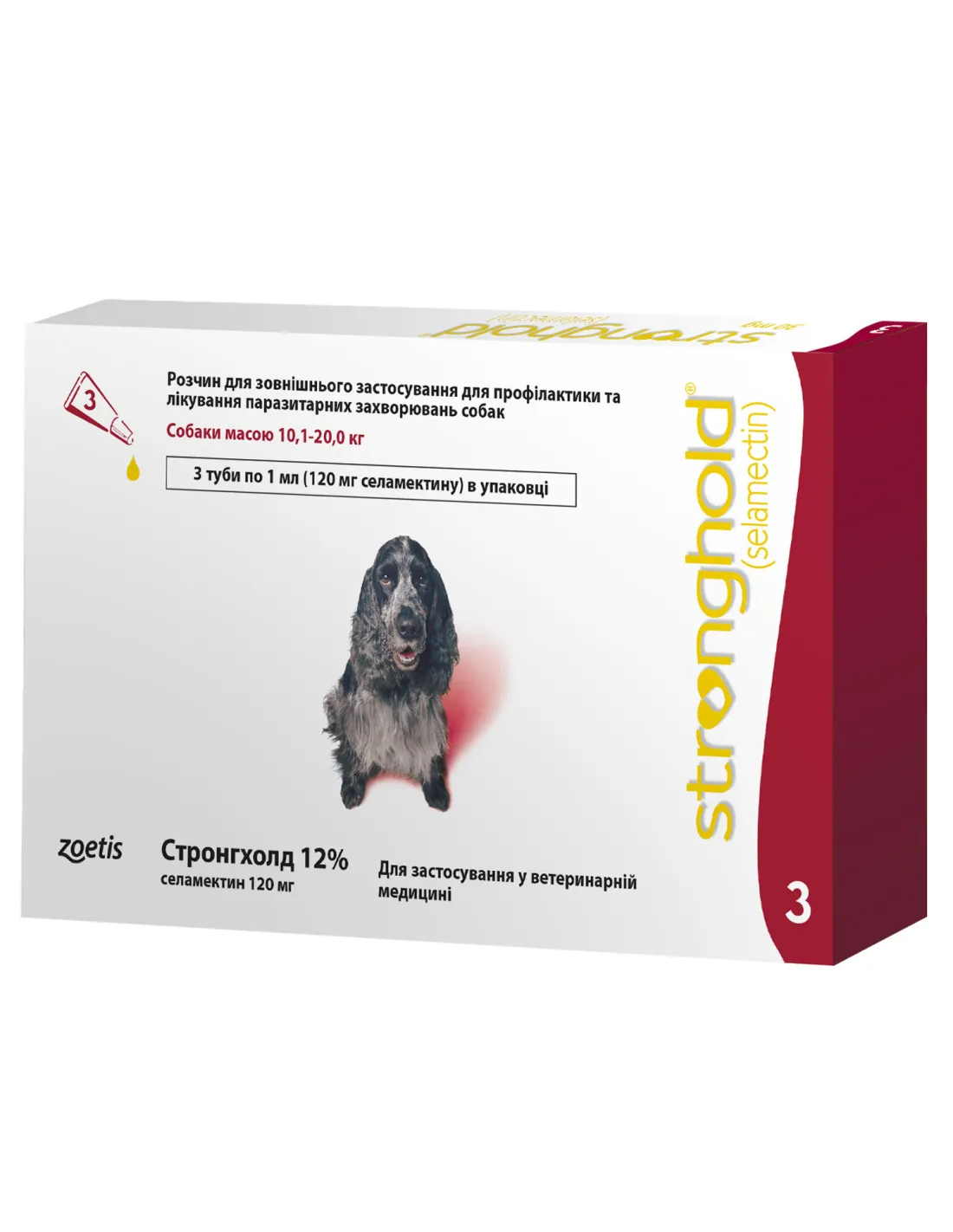 ЗАСТОСУВАННЯ: Препарат наносять на суху шкіру між лопатками в основі шиї. Для знищення бліх на тілі собак та котів Стронгхолд застосовують одноразово, а для попередження повторної інвазії – один раз на місяць. Для профілактики дирофіляріозу Стронгхолд призначають щомісяця, починаючи за місяць до початку льоту комарів і закінчують не раніше ніж через місяць після завершення їх льоту. Для лікування собак та кішок при отодектозі (вушній корості, викликаної кліщами Otodectes cynotis) Стронгхолд застосовують одноразово. Для лікування собак при саркоптозі (корості викликаної кліщами Sarcoptes scabiei) Стронгхолд застосовують дворазово з інтервалом 1 місяць. Для профілактики можливої інвазії рекомендується застосовувати Стронгхолд 1 раз на місяць. Для дегельмінтизації собак та кішок при нематодозах (глистих інвазіях, що викликаються Toxocara cati, Toxocara canis, Ancylostoma tubaeformae) Стронгхолд застосовують одноразово, з метою профілактики – щомісяця. Цуценята та кошенята до 2,5 кг - 15 мг Коти до 7,5 кг - 45 мг Собаки 2,6 – 5 кг - 30 мг Собаки 5,1 - 10, 0 кг - 60 мг Собаки 10,1 -20,0 кг - 120 мг Собаки 20,1 - 40, 0 кг - 240 мг