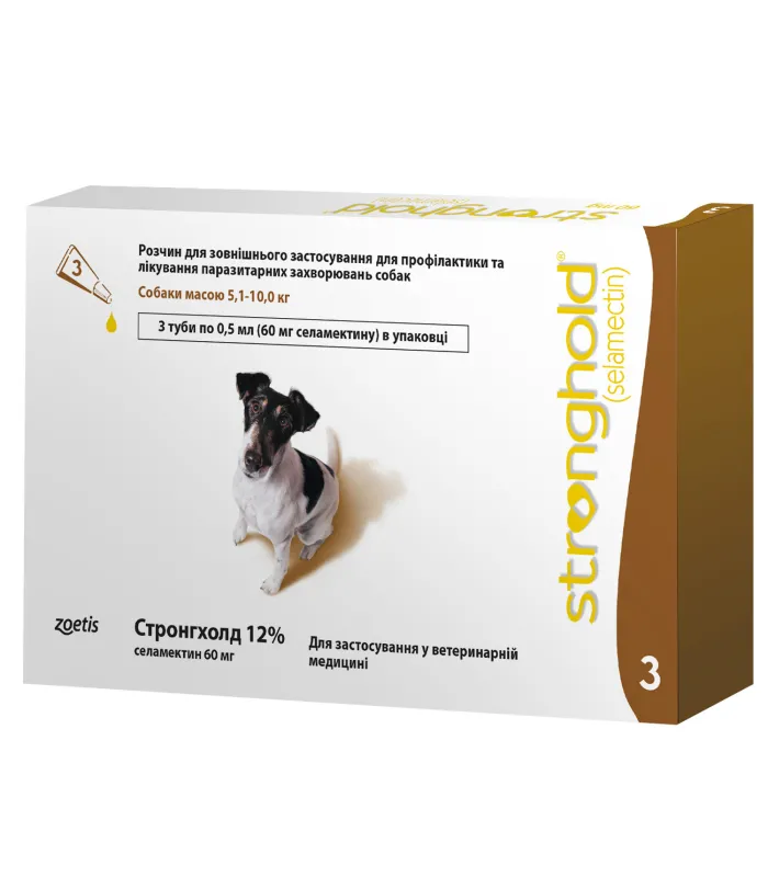 ЗАСТОСУВАННЯ: Препарат наносять на суху шкіру між лопатками в основі шиї. Для знищення бліх на тілі собак та котів Стронгхолд застосовують одноразово, а для попередження повторної інвазії – один раз на місяць. Для профілактики дирофіляріозу Стронгхолд призначають щомісяця, починаючи за місяць до початку льоту комарів і закінчують не раніше ніж через місяць після завершення їх льоту. Для лікування собак та кішок при отодектозі (вушній корості, викликаної кліщами Otodectes cynotis) Стронгхолд застосовують одноразово. Для лікування собак при саркоптозі (корості викликаної кліщами Sarcoptes scabiei) Стронгхолд застосовують дворазово з інтервалом 1 місяць. Для профілактики можливої інвазії рекомендується застосовувати Стронгхолд 1 раз на місяць. Для дегельмінтизації собак та кішок при нематодозах (глистих інвазіях, що викликаються Toxocara cati, Toxocara canis, Ancylostoma tubaeformae) Стронгхолд застосовують одноразово, з метою профілактики – щомісяця. Цуценята та кошенята до 2,5 кг - 15 мг Коти до 7,5 кг - 45 мг Собаки 2,6 – 5 кг - 30 мг Собаки 5,1 - 10, 0 кг - 60 мг Собаки 10,1 -20,0 кг - 120 мг Собаки 20,1 - 40, 0 кг - 240 мг