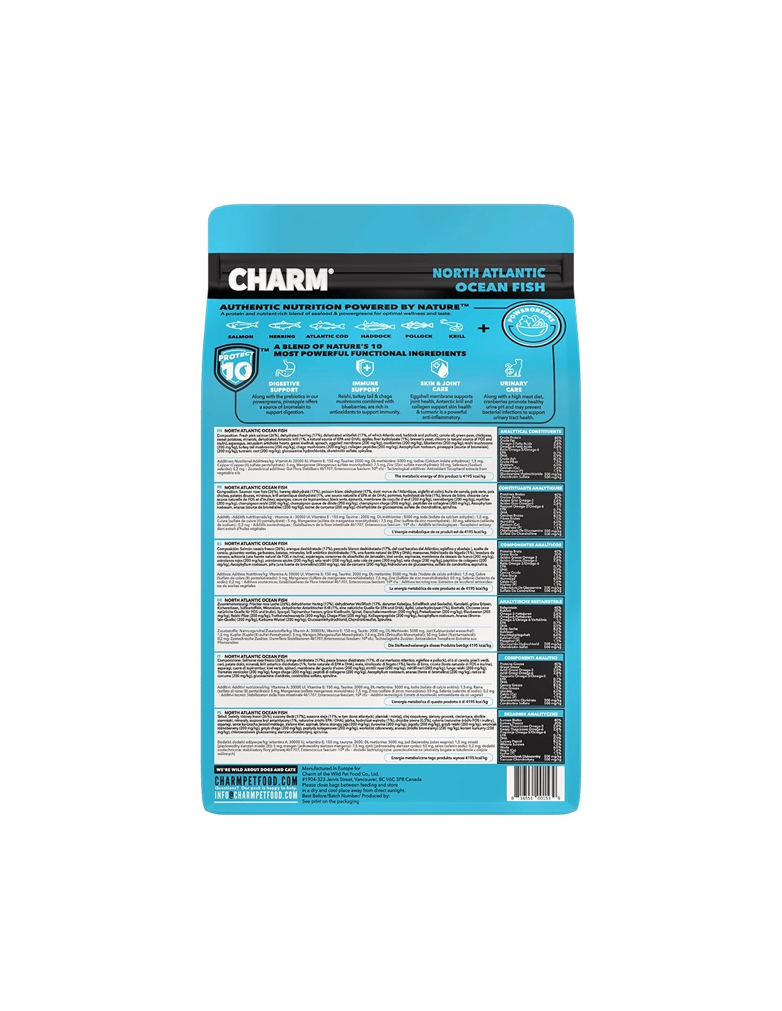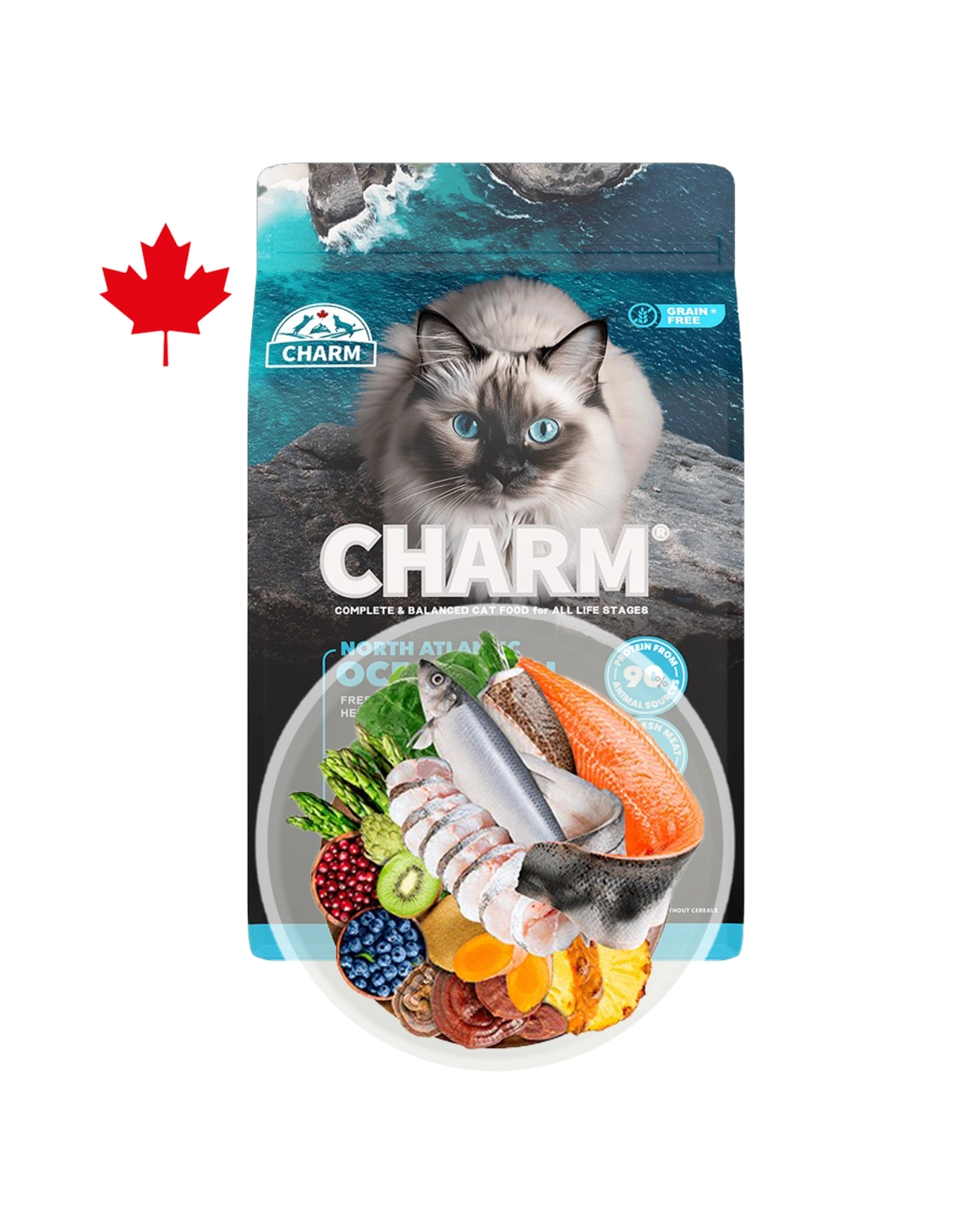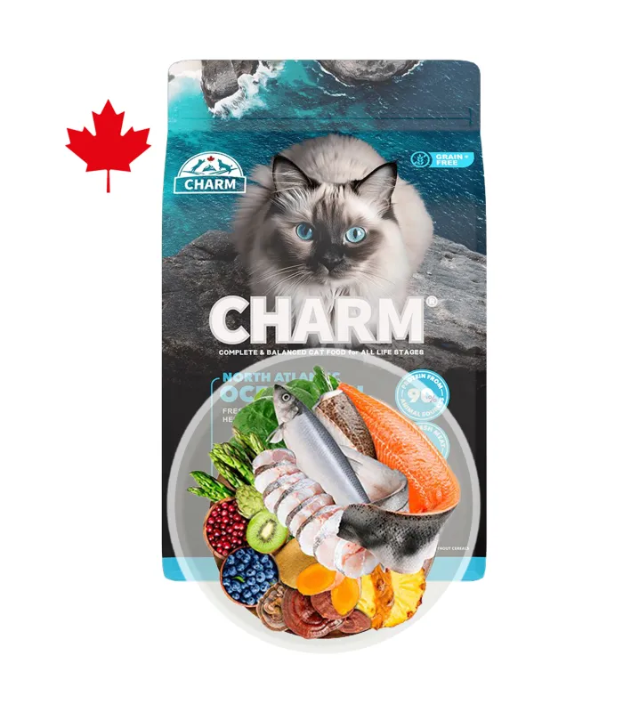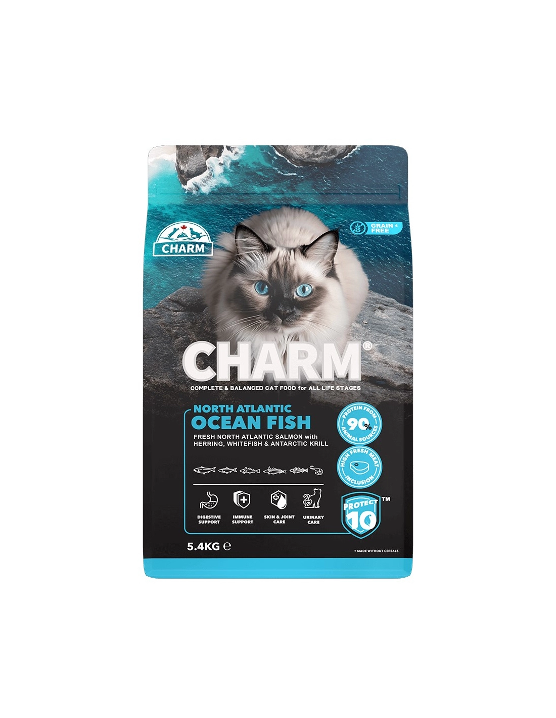 Charm North Atlantic Ocean Fish – це високоякісний беззерновий холістик корм для котів, створений на основі 5 видів північноатлантичної риби, зокрема 26% свіжої горбуші. Раціон повністю відповідає природним потребам хижаків, забезпечуючи їхній організм необхідними амінокислотами, білками та корисними жирами.