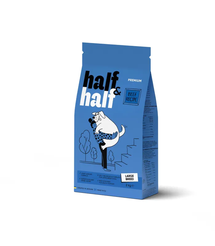 Повноцінний сухий корм Half&Half для дорослих собак великих порід від 25 кг. Забезпечує собаку необхідними поживними речовинами для здорового та активного життя.