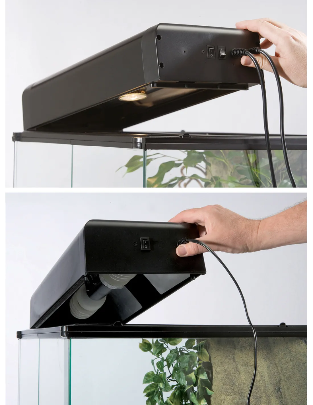 Можна створити комбінацію різних компактних люмінесцентних ламп Exo Terra Repti Glo (# PT2226, PT2227, PT2228) для створення ідеального співвідношення ультрафіолетового/візуального світла або поєднання з джерелом розжарювання, таким як денна теплова лампа (# PT2100-PT2114) для підвищення температури навколишнього повітря. Додаткові аксесуари, такі як цифровий термометр Exo Terra (# PT2472) і гігрометр (# PT2477), а також термостат і гігростат Exo Terra, можна вставити у спеціальний ковзаючий ободок у верхній частині навісу.
