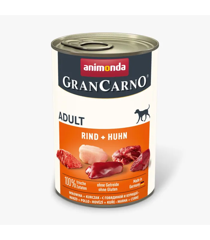 Для собак Animonda пропонує лінію GranCarno, яка забезпечує збалансоване харчування з високим вмістом м’яса. Ці вологі корми розроблені для дорослих собак віком від 1 до 6 років і не містять зерна, глютену, сої, цукру чи штучних добавок. GranCarno ідеально підходить для собак будь-якого розміру, від маленьких до великих порід, завдяки різноманітним варіантам і точним рекомендаціям щодо годування.
