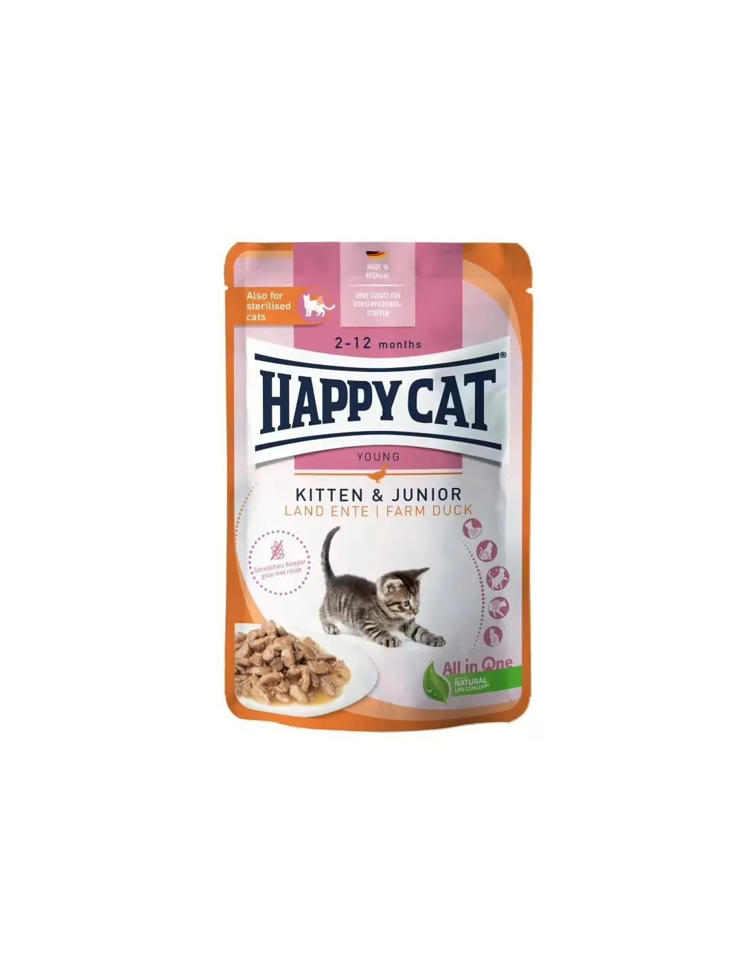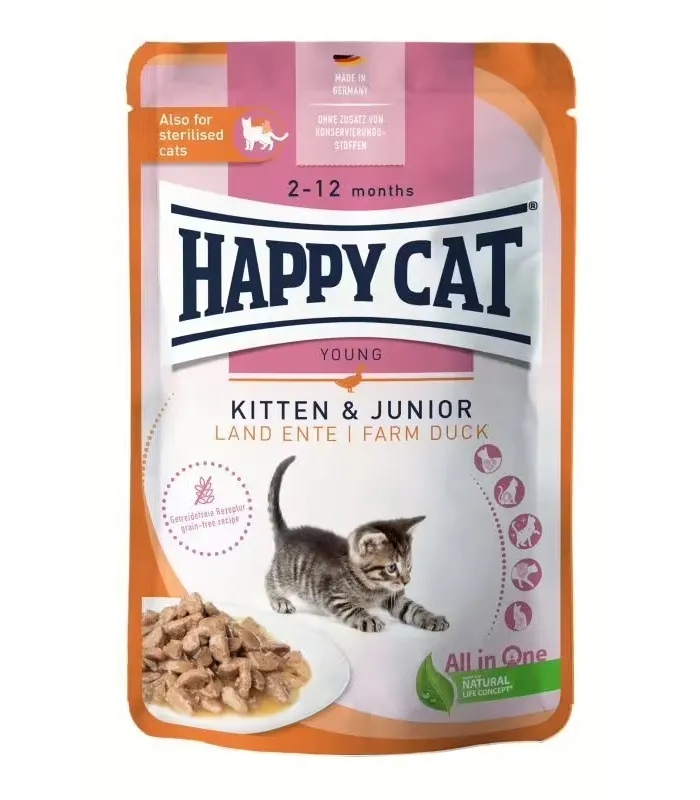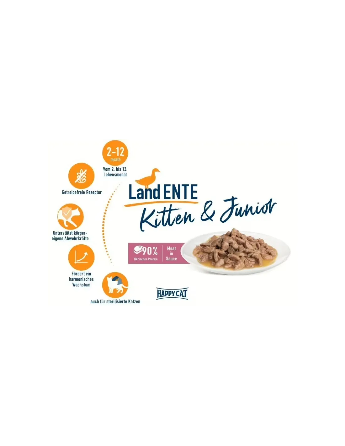 Вологий корм для кошенят Happy Cat Meat in Sauce Kitten & Junior Country Duck створений спеціально для малюків віком від 2 до 12 місяців. Завдяки 90% тваринного білка цей раціон забезпечує гармонійний ріст, розвиток та підтримку імунної системи організму.