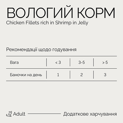 - Апетитні креветки (4.00%): Надають корму неповторного аромату, вишуканого смаку та є природним джерелом таурину, важливого для здоров'я серця та зору котів.