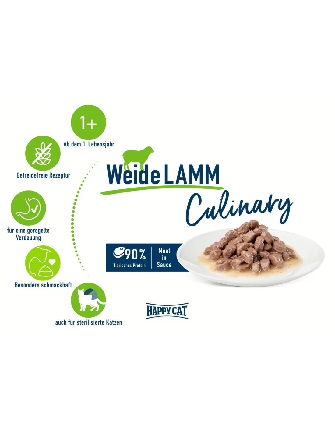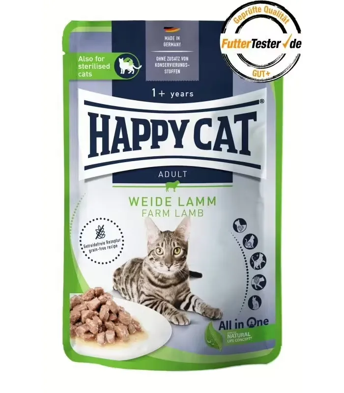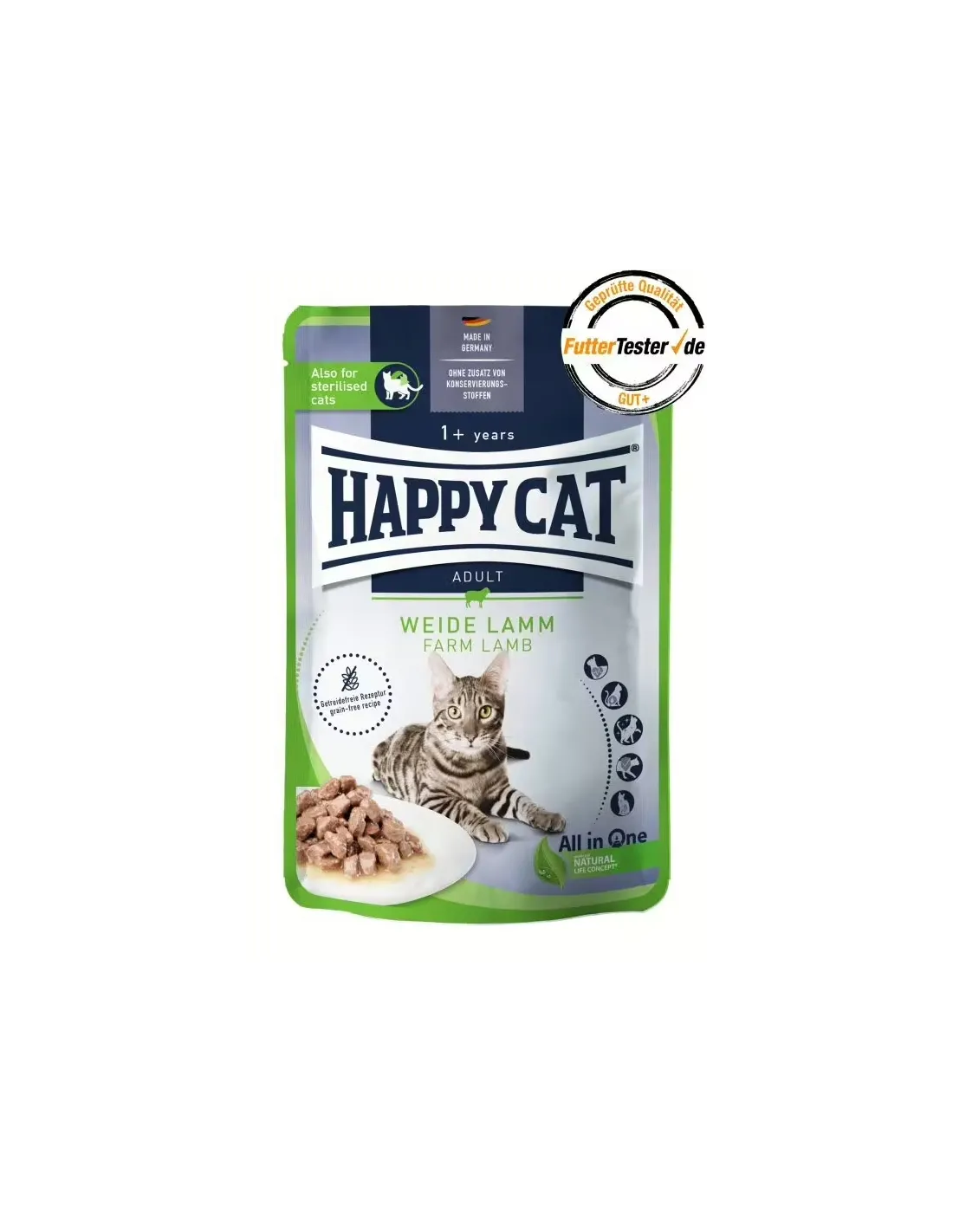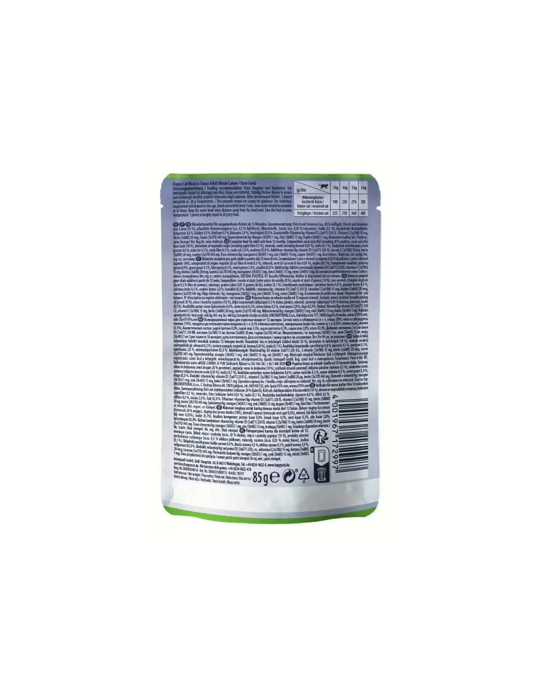 Happy Cat Meat in Sauce Culinary Pasture-Fed Lamb – це вишуканий вологий корм для котів із ніжною ягнятиною у соусі, створений спеціально для підтримки здоров’я та гармонійного розвитку вашого улюбленця. Рецепт без зерна, понад 90% тваринного білка, легка засвоюваність і збалансований склад роблять його ідеальним вибором навіть для кастрованих та стерилізованих котів.
