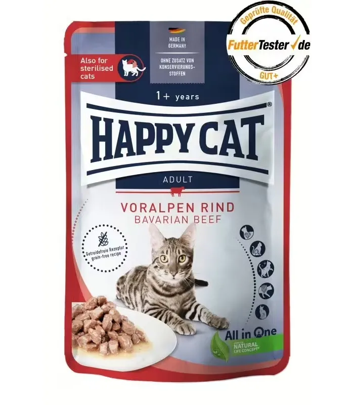 Happy Cat Bavarian Beef – смачний та корисний вибір для вашого улюбленця, який поєднує натуральні інгредієнти, високий вміст м’яса та збалансоване харчування.