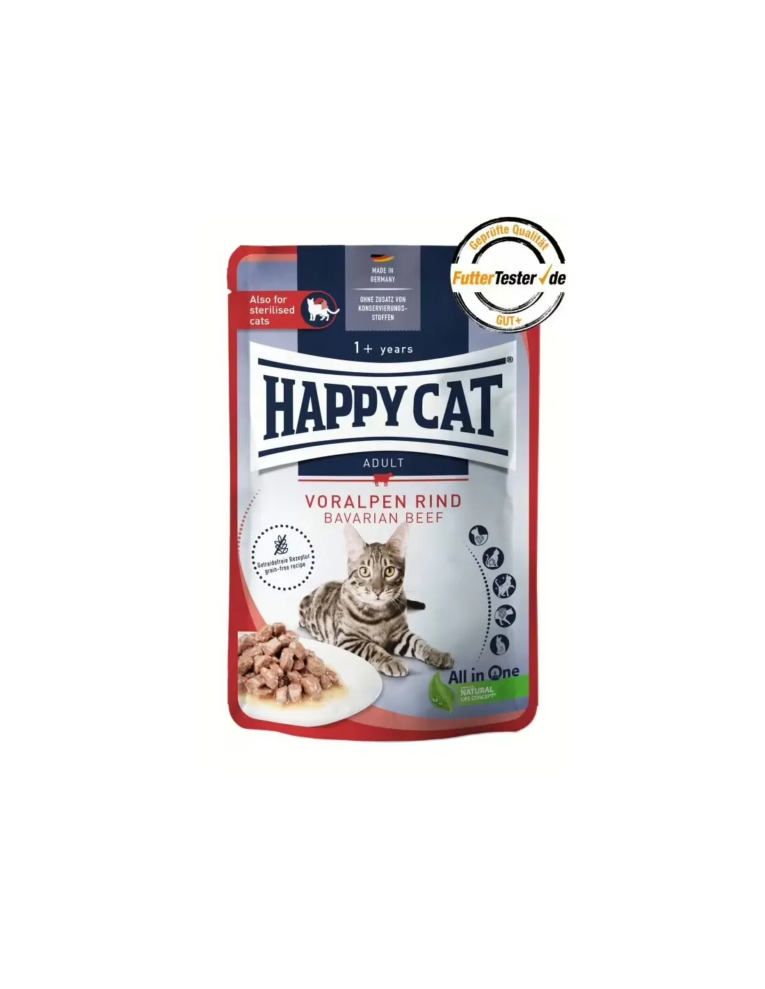 Happy Cat Bavarian Beef – це відбірний вологий корм для котів у ніжному соусі з ситною яловичиною. Рецепт без зерна створений спеціально для стерилізованих і кастрованих котів, забезпечує повноцінне харчування, підтримує здоров’я сечовивідних шляхів та сприяє збалансованому водному балансу.