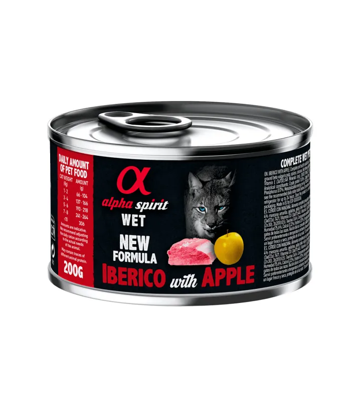 Вологий корм Alpha Spirit Iberian Pork With Yellow Apple для дорослих котів готується з інгредієнтів преміальної якості з добавкою таурину, де єдиним джерелом протеїну – є іберійська свинина (93%).
