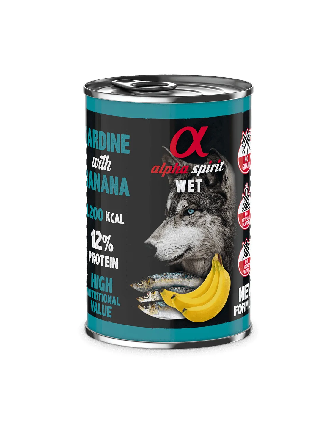 Вологий корм Alpha Spirit Alpha Spirit Sardine with Banana готується з використанням єдиного джерела протеїну – сардини, з додаванням шматочків свіжого банана .