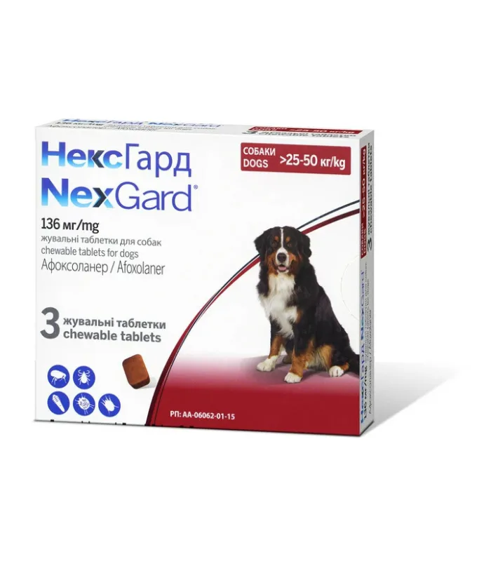Жувальні таблетки Boehringer Ingelheim Nexgard (Нексгард) від бліх і кліщів для собак вагою 25-50 кг (XL) 3 шт. x6.0 г в уп.